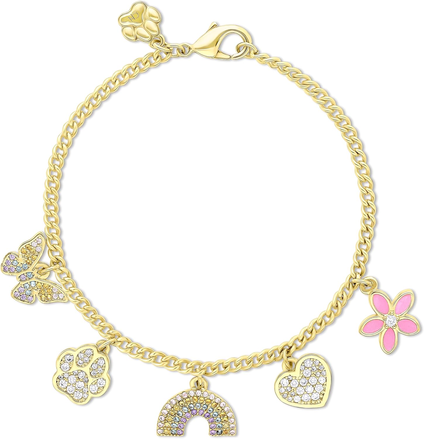 Cloud Haven 24K Gold Plated Charm Bracelet for Women with Crystal CZ Butterfly, Paw Print, Rainbow Heart and Flower Charms