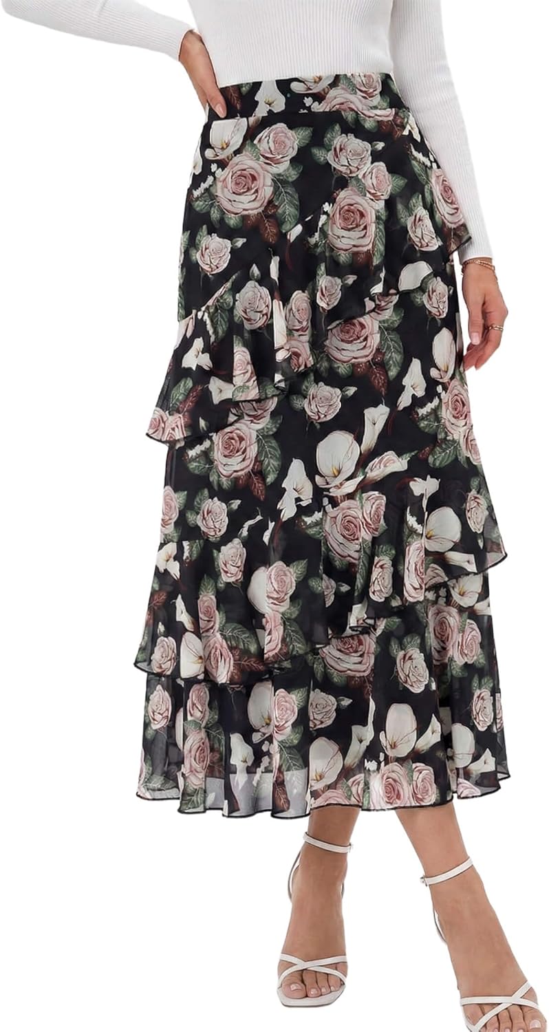 DERAX Women's Floral Boho Midi Skirt A Line Tiered Ruffle Chiffon High Waist 2026 Spring Summer Long Skirts