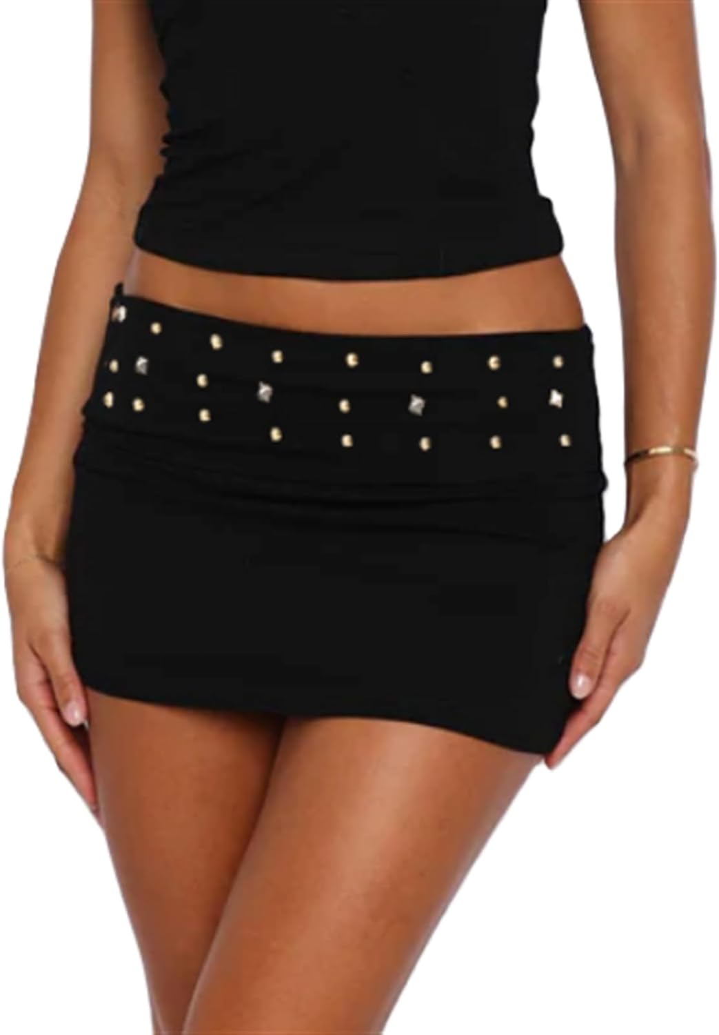 Women Studs Fold Over Micro Skirt Low Waist Punk Bodycon Mini Skirts Trendy Skinny Night Out Party Skirt