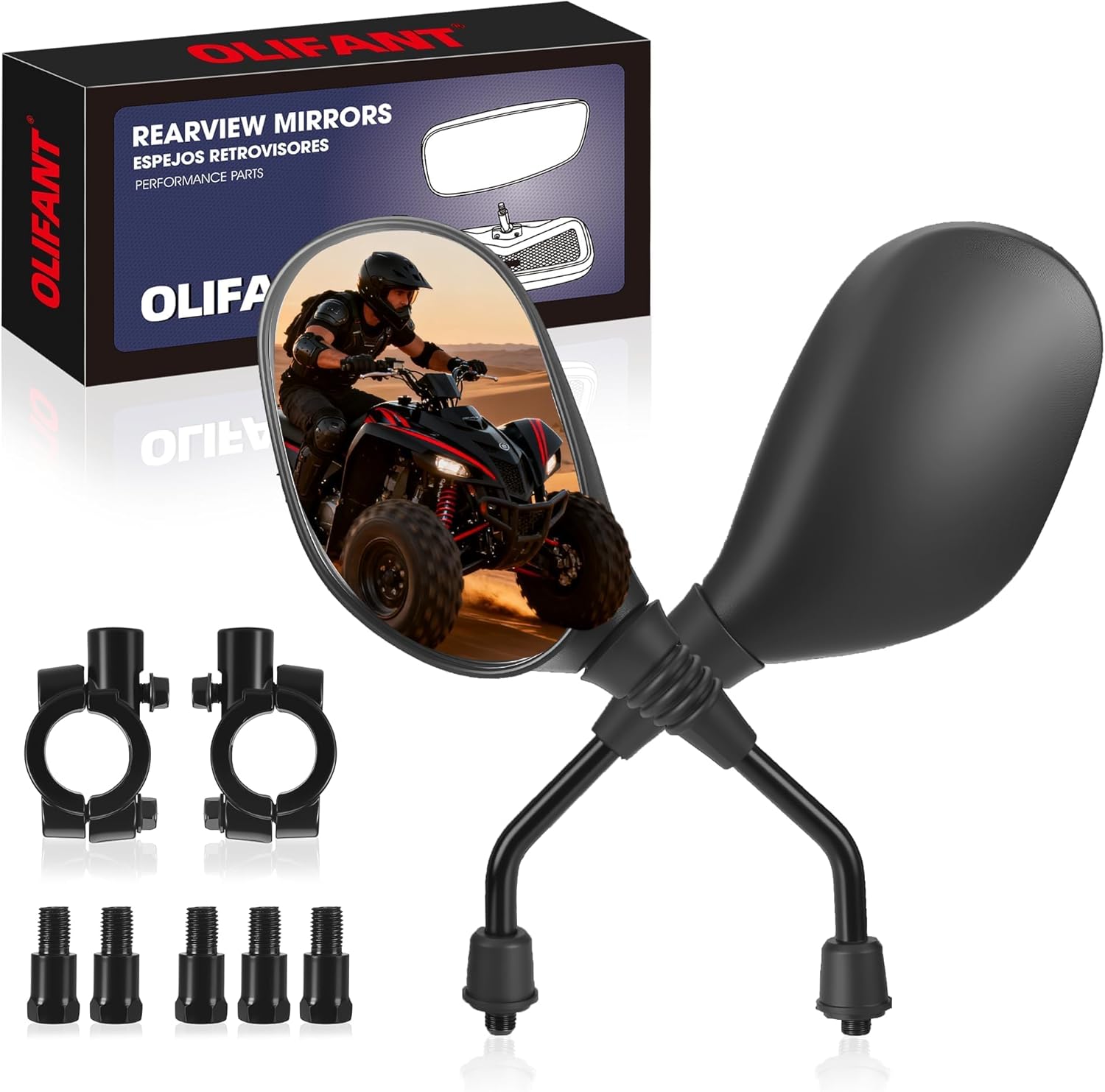 - ATV rearview mirrors deliver versatile compatibility with included 8mm and 10mm adapter nuts and a 7/8" handlebar mount clamp. Package included:1 Pair of Motorcycle Mirrors,2 x Mirror Clamps,2 x M8 Standard adapter,1 x M10 Reverse adapter,2 x M10 Standard adapter