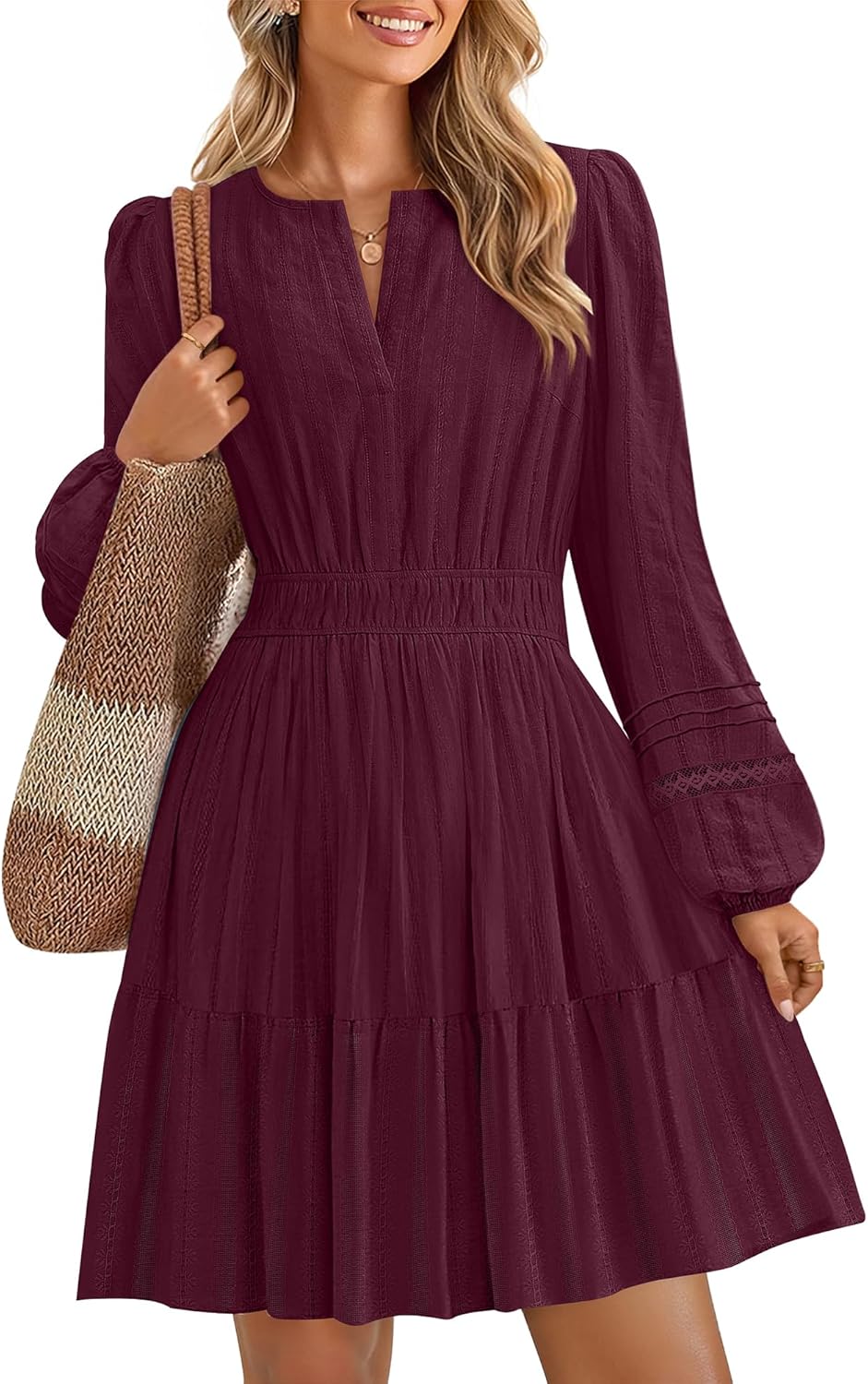 ZESICA Long Sleeve V Neck Mini Dresses for Women 2026 Spring High Waist Ruffle Pleated A Line Cocktail Party Short Dress