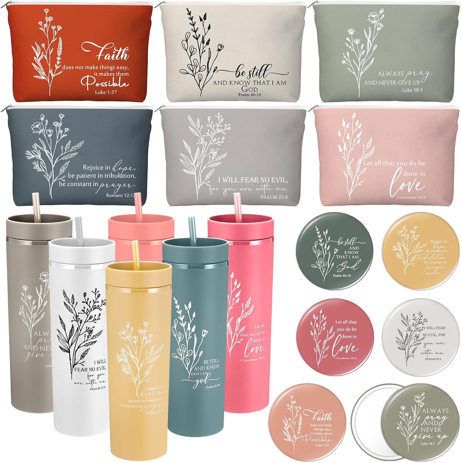 Fumete 6 Sets Christian Gift for Men Women Bible Verse Skinny Tumbler with Straw Religious Cosmetic Bag Compact Mirror for Sunday School Teacher Appreciation Gift (Elegant Color)