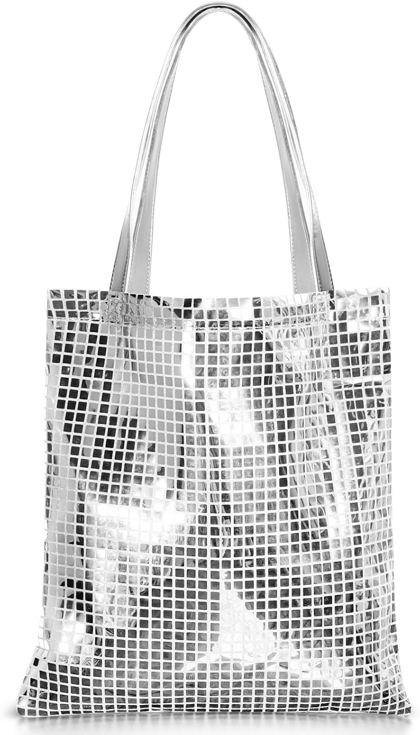 Paterr Disco Silver Tote Bag 15.75 x 14.96'' Sequin Tote Bag 80s 90s Party Silver Glitter Bachelorette Gift Reusable Grocery Shopping Shoulder Bags for Retro Disco Party Wedding Bridal Shower Favors