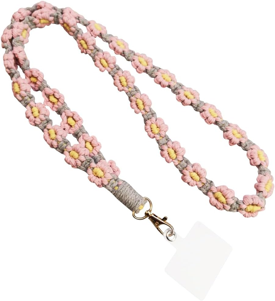 Boho Macrame Braided Daisy Flowers Cell Phone Lanyard, Universal Handmade Crossbody Phone Lanyard with Tether Tab