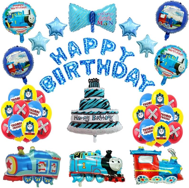 - COMPLETE PARTY SET: Includes 1 blue happy birthday banner, 1 cake balloon, 1 blue bow balloon, 3 Thomas Train balloon, 4 circular balloon, 4 star balloons, and 24 latex balloons.