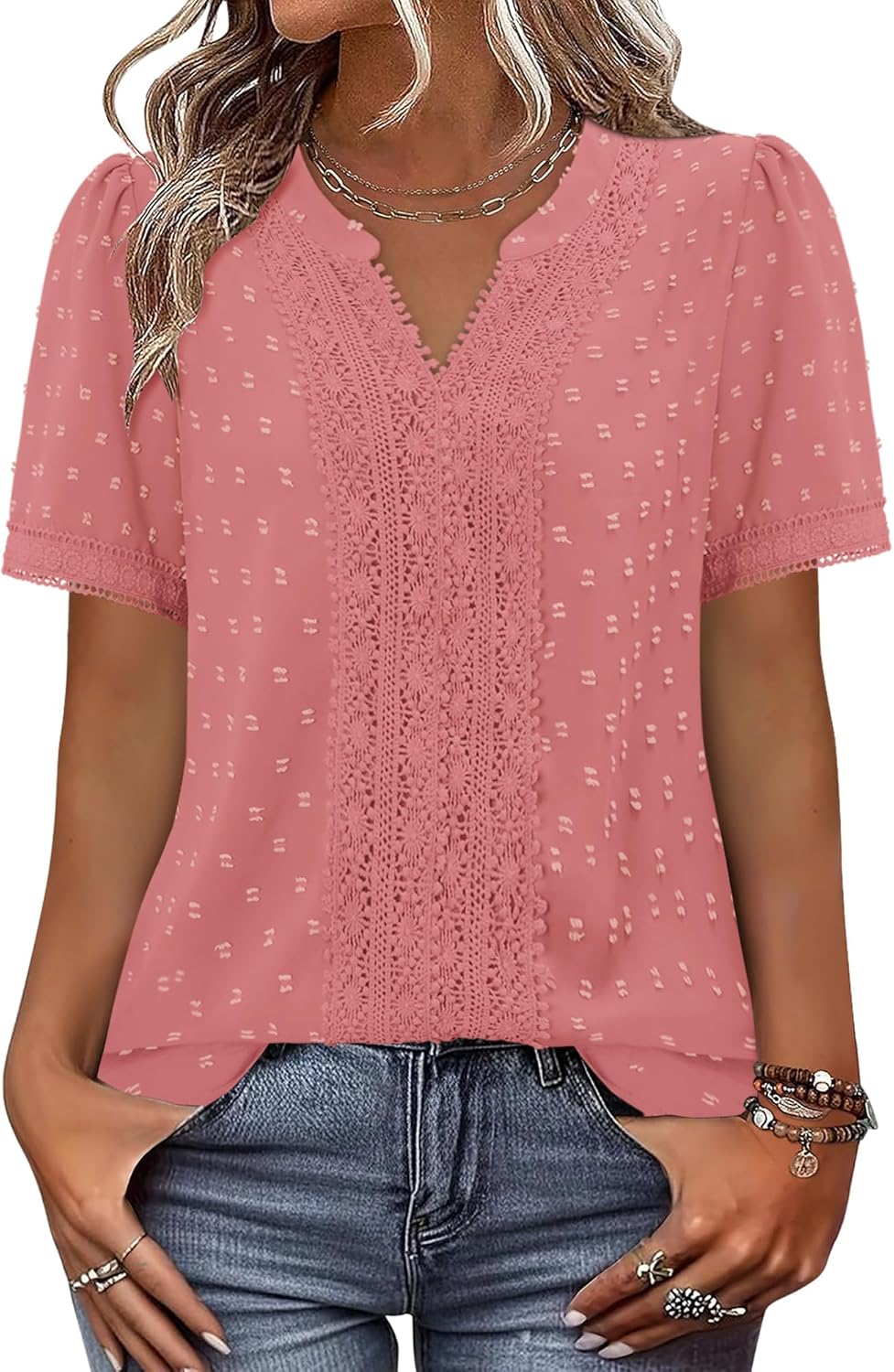 Falechay Womens Tops Summer Short Ruffle Sleeve V Neck Blouses Cute Boho Swiss Dot Lace Shirts Casual Flowy RIC Rac Trims Tee