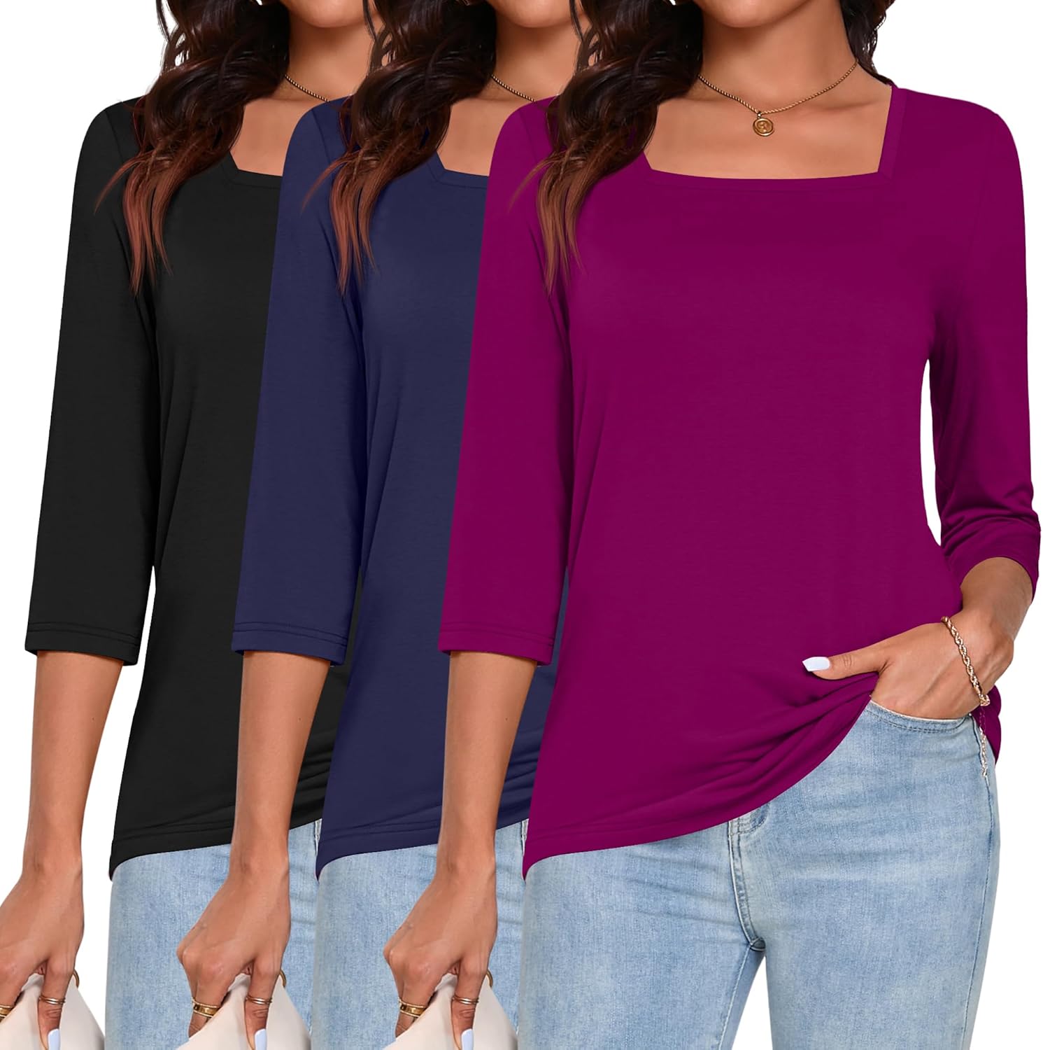 Ficerd 3 Pack 3/4 Sleeve Tops for Women Square Neck Shirts Loose Fit Casual Ladies Blouses Tops Fall Basic Tees