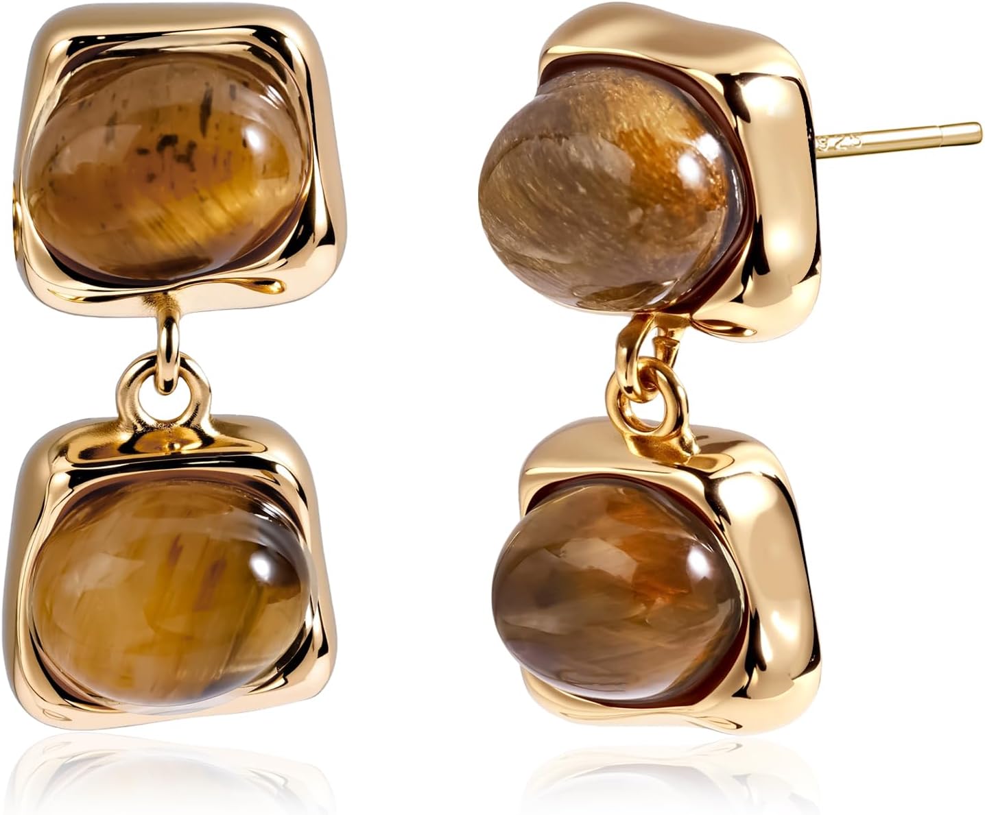 Vintage 14k Gold Plated Dangle Earrings for Women, Tiger Eye Drop Earrings Jewelry for Women