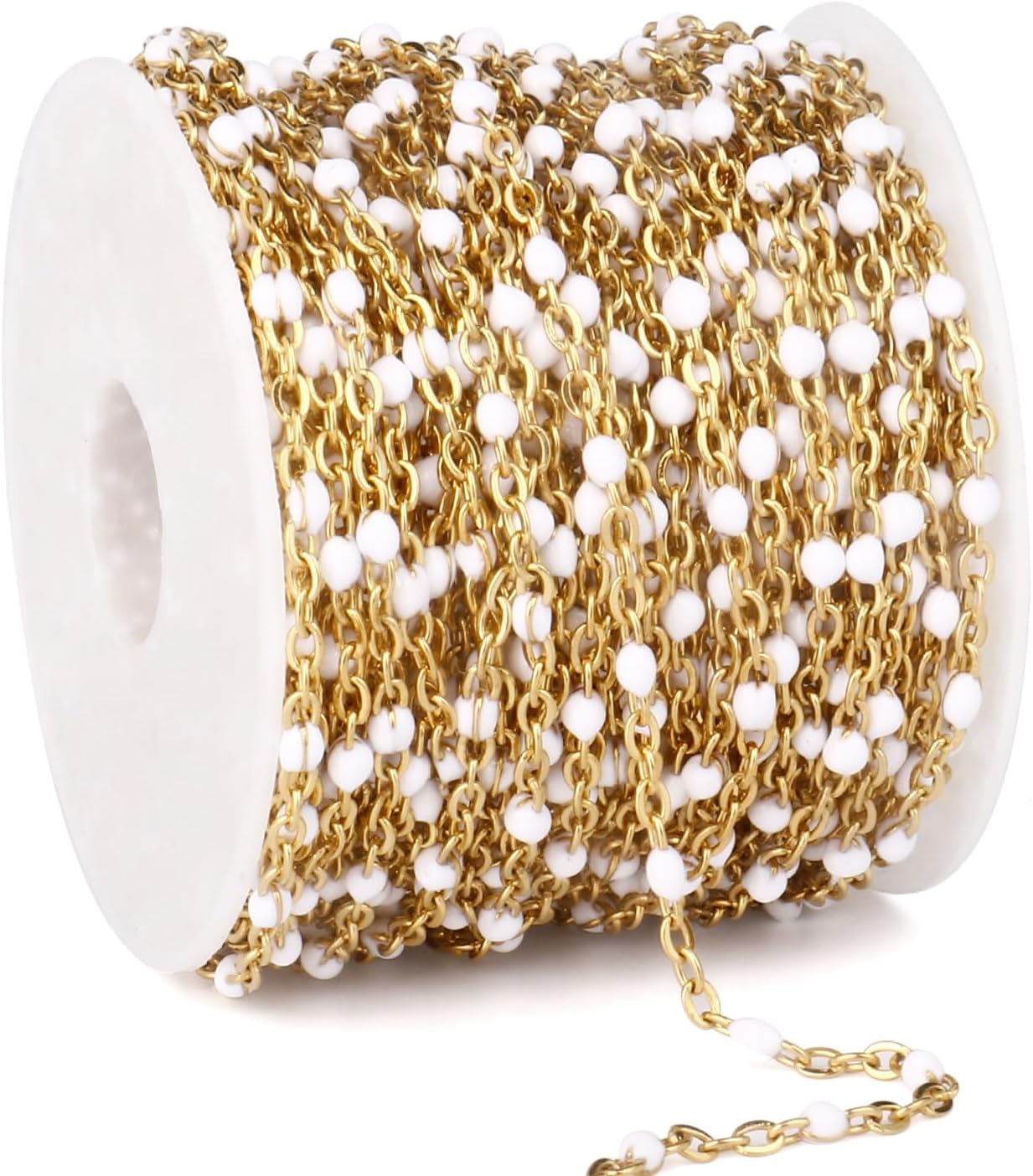 33 Feet Gold Enamel Chains Bulk, 2mm 18K Gold PVD Plated 304 Stainless Steel White Enamel Beaded Cable Link Chain Roll Spool for Jewelry Making