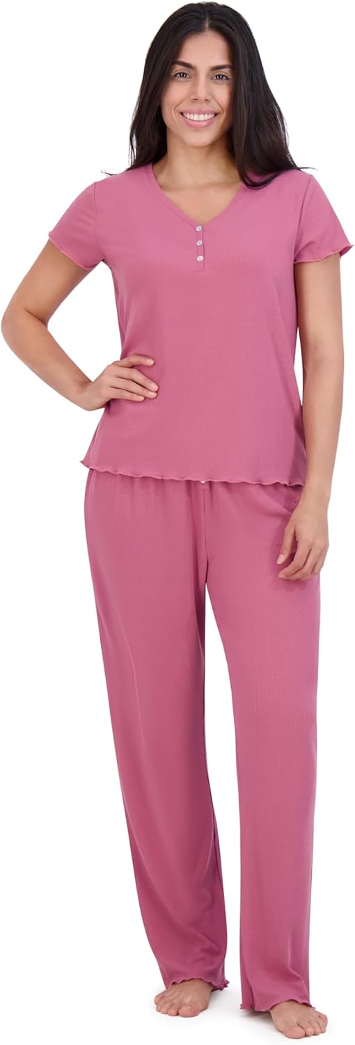 Aerosoles Women's Ribbed Henley Cozy Pjs 2 Piece Cozy Comfy Lounge Soft Cotton Sleepwear Button-up Pajama Set, Heather Rose, X-Large