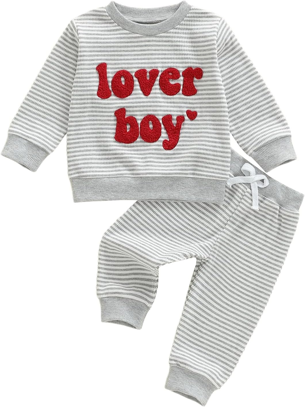 Toddler Baby Boy Valentines Day Outfit Lover Boy Embroidery Waffle Knit Long Sleeve Sweatshirt and Pants Set