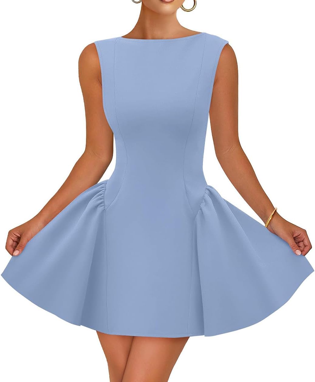 ZESICA Women's 2026 Summer Sleeveless Cocktail Mini Dress Boat Neck Backless Swing A Line Wedding Club Party Short Dresses
