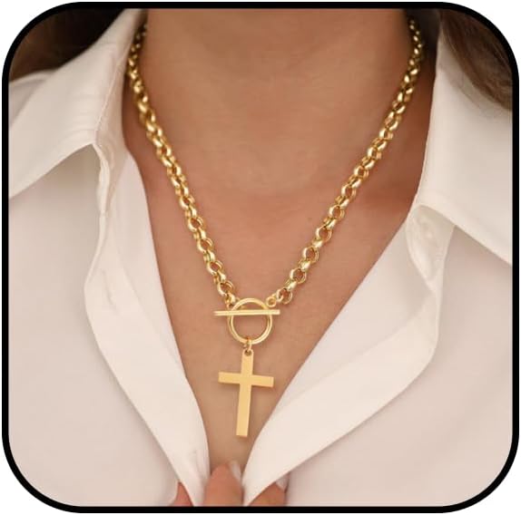 Chunky Cross Necklace for Women 18K Gold Plated Chunky Necklace Trendy Toggle Necklaces Dainty Statement Jewelry