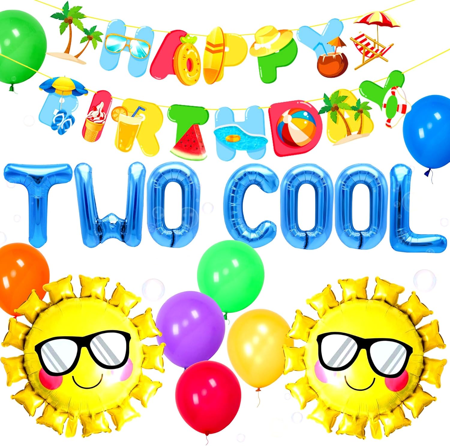 - What you will receive: 1 x Two Cool letter Balloons, 1 x beach birthday banner,14 x latex balloons, 2x sun balloons.