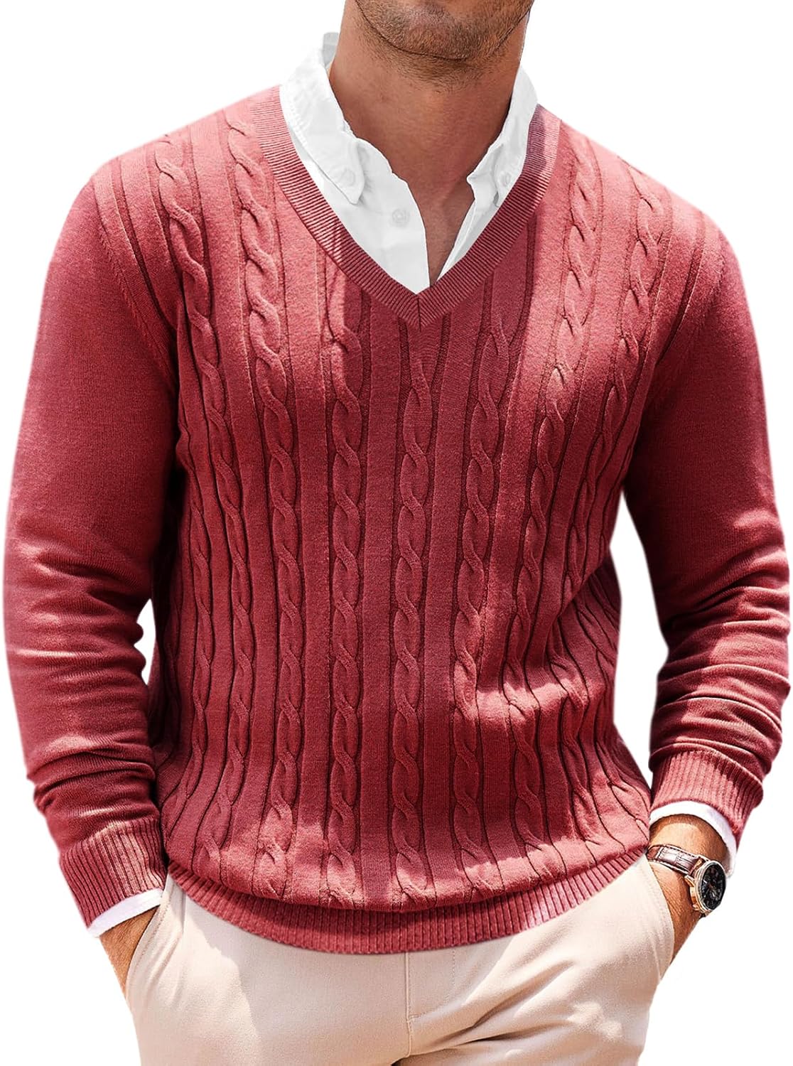 Runcati Mens V Neck Sweater Cable Knit Long Sleeve Casual Ribbed Twisted Pullover Sweaters
