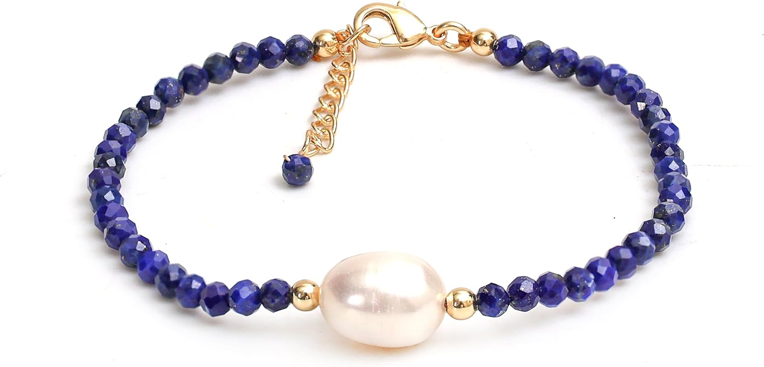 Gempires Handmade Beaded Crystal Bracelets with Freshwater Pearl Gemstone Jewelry Hypoallergenic 7.5 Inch Gold Plated Everyday Wear Bracelet Gifts (Lapis Lazuli)