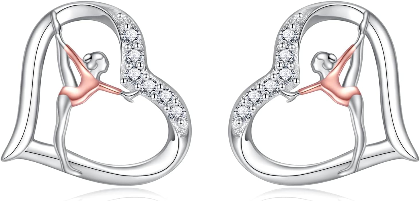 925 Sterling Silver Gymnastics Stud Earrings: Heart Gymnastics Gifts for Women Round Crystal Gymnast Stud Earrings Fashion Jewelry Gift for Daughter Niece