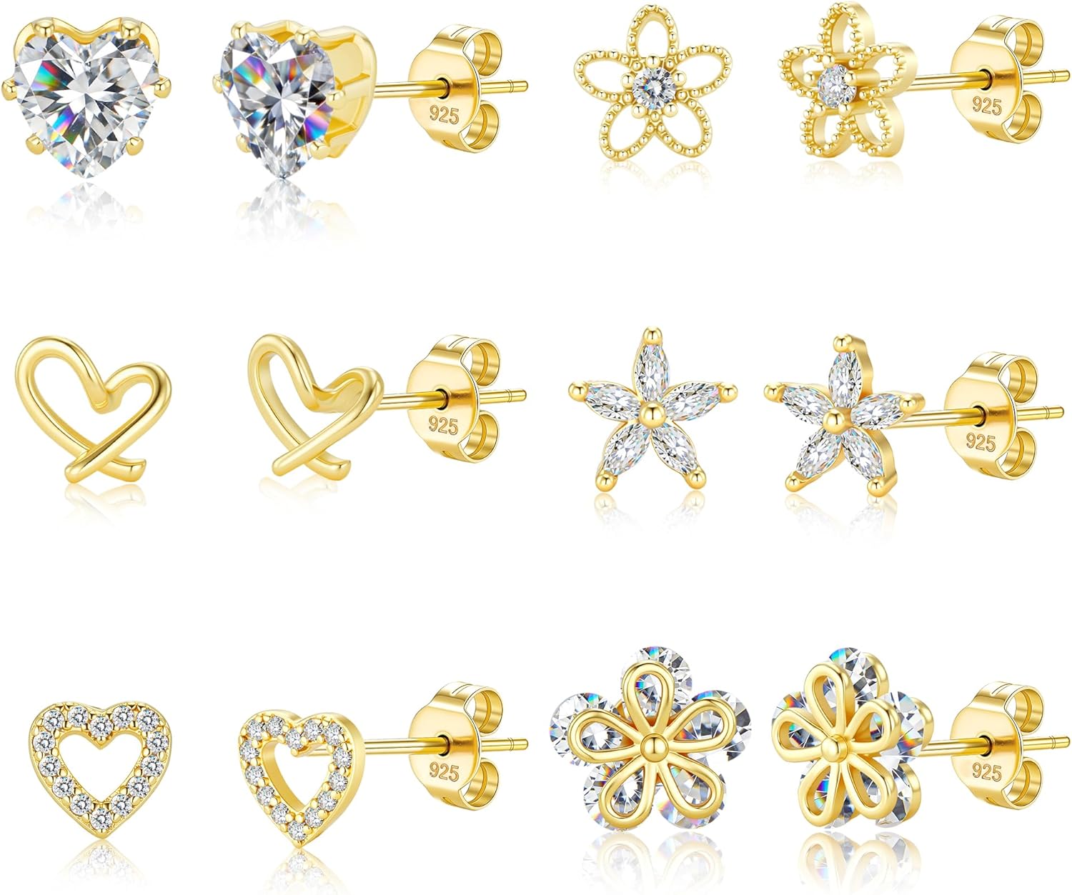 ALEXCRAFT Small Gold Stud Earrings - 6 Pairs Cute Heart Studs for Women - Cubic Zirconia - Hypoallergenic - Pack