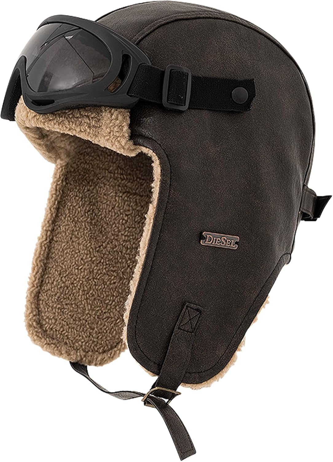Peicees Vintage Aviator Hat and Goggles Waterproof Leather Trapper Hat with Ear Flaps Pilot Costume for Adult Ski Goggles