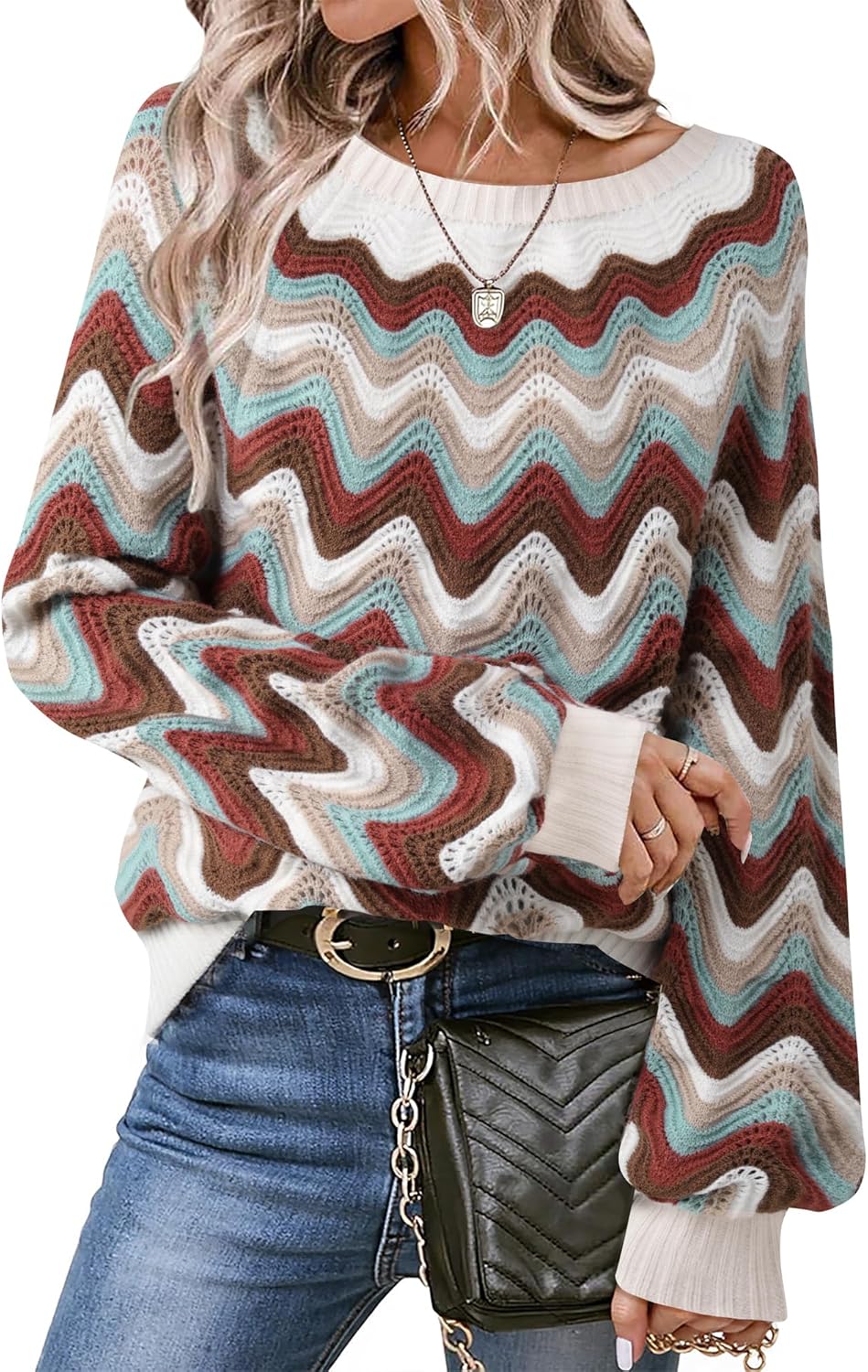 Vivilli Womens Fall Sweaters Color Block Cozy Lantern Long Sleeve Crewneck Knit Crochet Pullover Tops Trendy Clothes