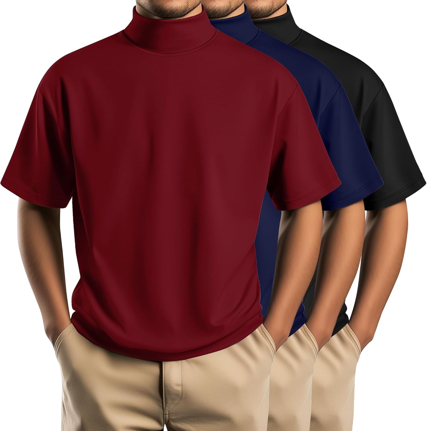 Huukeay 3 Pack Men's Big and Tall Shirts, Cotton Short Sleeve Turtleneck Tops Loose Fit Plus Size Mock Turtleneck Basic Tee(Wine Red, Navy Blue, Black,4X-Large)