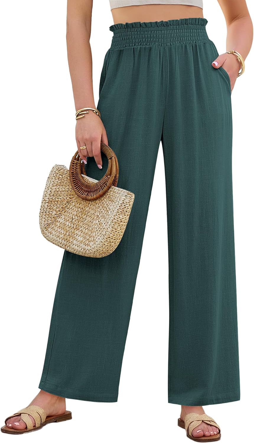 GRAPENT Linen Pants for Women Wide Leg High Waisted Paper Bag Smocked Waist Casual Summer Beach Vacation Palazzo Pants