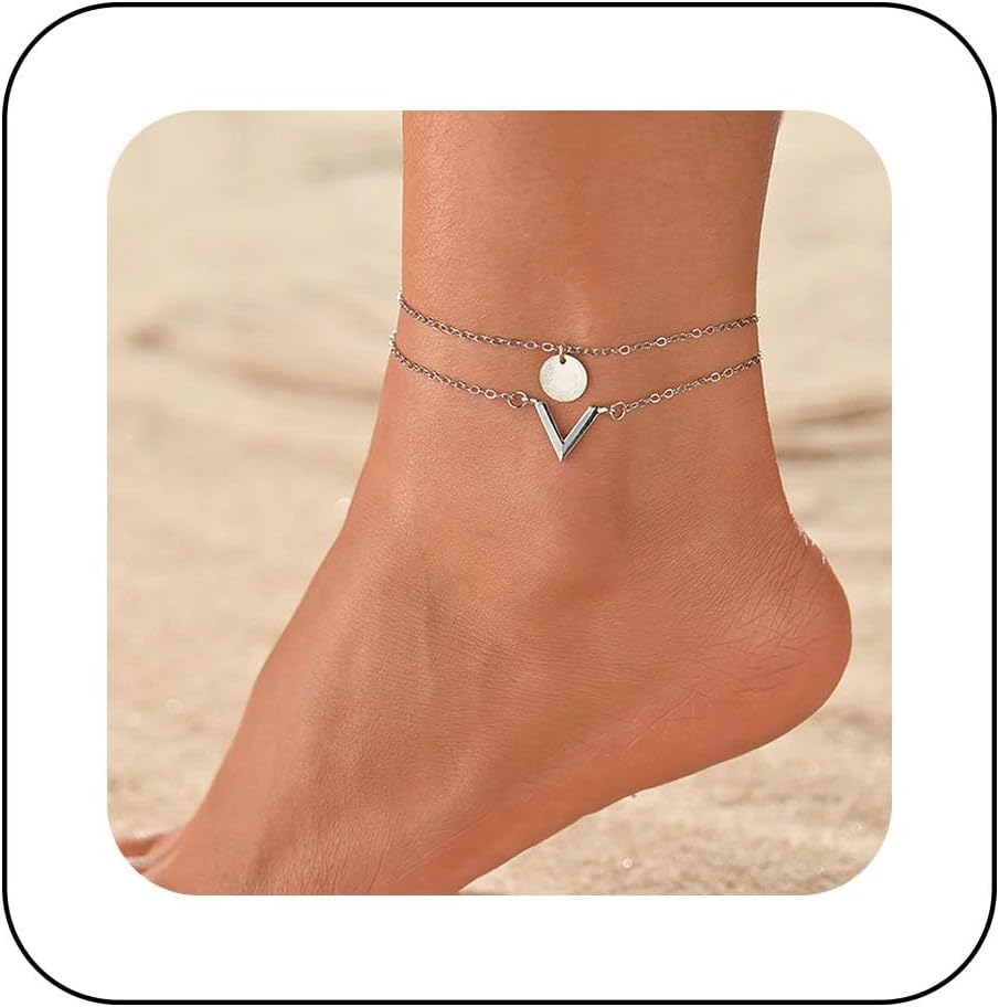 Bohemian Layered Disc Ankle Bracelet Gold Initial V Ankle Chain Bracelet Layered Letter V Beach Anklet Chain Small Coin Foot Chain Anklet Summer Beach Foot Chain Jewelry for Women