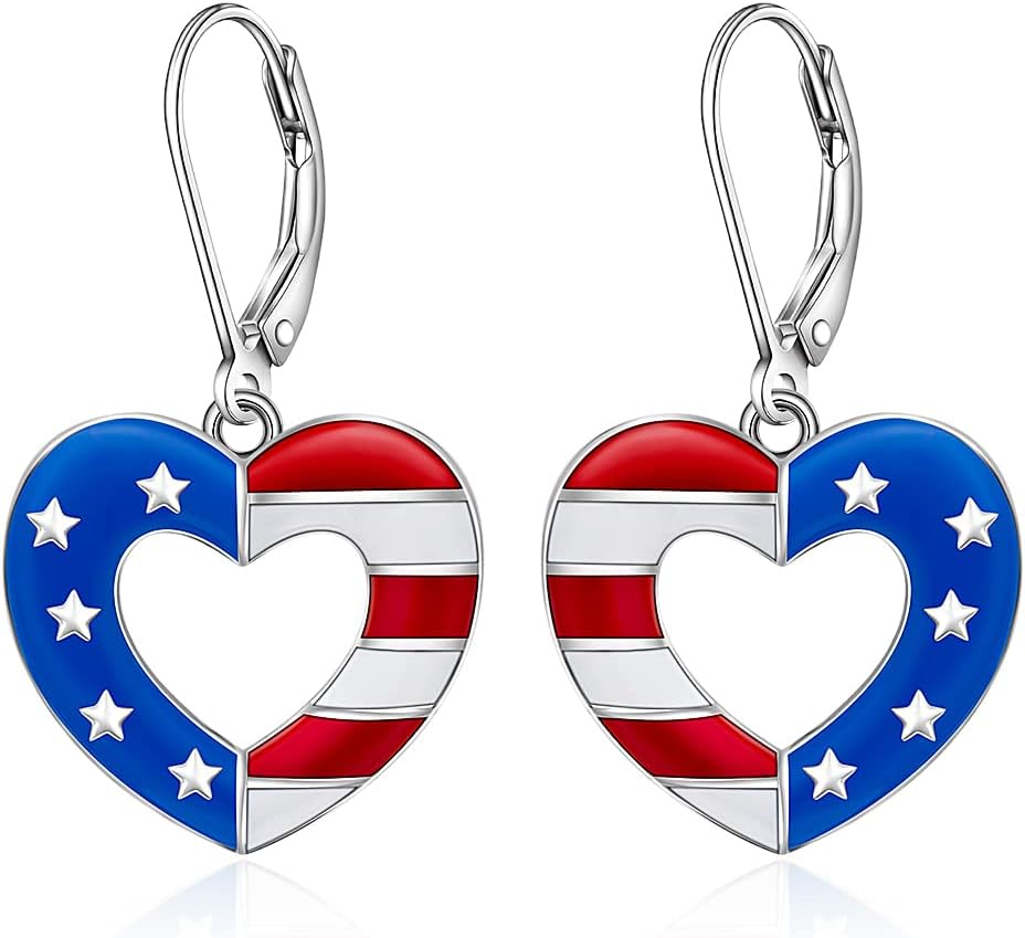 Patriotic 4th of July Earrings for Women American Flag Heart Earrings Red White and Blue Fourth of July Dangle Jewelry Sterling Silver USA Independence Day Patriots Gifts