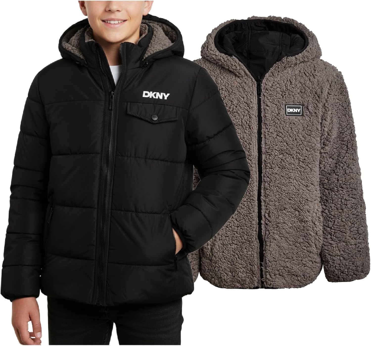 DKNY Boys Puffer Jacket - Reversible Zip Up Kids Winter Coat Sherpa Jacket with Hood - Outerwear Jackets for Boys