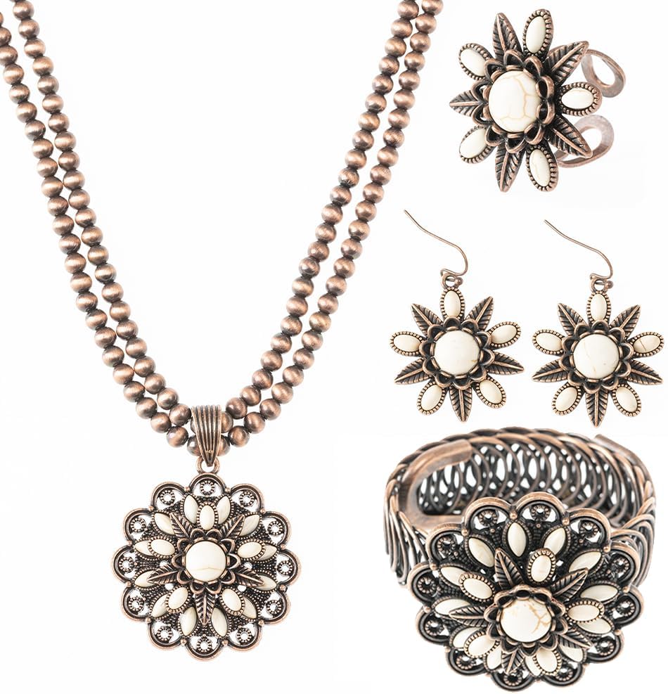 4 Pack Boho Vintage Turquoise Jewelry for Women, Bohemian Western Jewelry Set with Vintage Turquoise Necklace Dangle Earrings Stretchable Bracelet Ring, Country Cowgirl Accessories for Gift