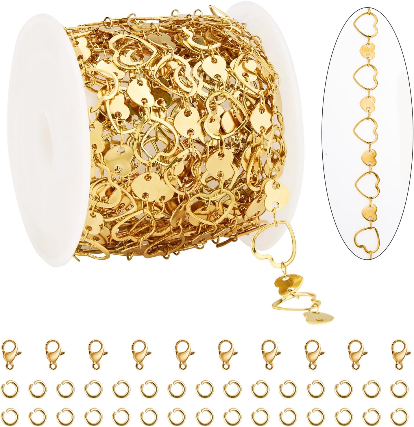 - Jewelry Making Chain Set--You will receive 1 roll about 13 feet (4 meters/4.3 yards) heart chains for jewelry making, which coming with 10 pieces stainless steel lobster clasps and 30 pieces stainless steel jump rings. The size of the hollow heart is about 10mm long and 9.37mm wide; the size of sequin heart is about 6.48mm long and 5.72mm wide. Enough jewelry making supplies will allow you to diy your personalized jewelry crafts.