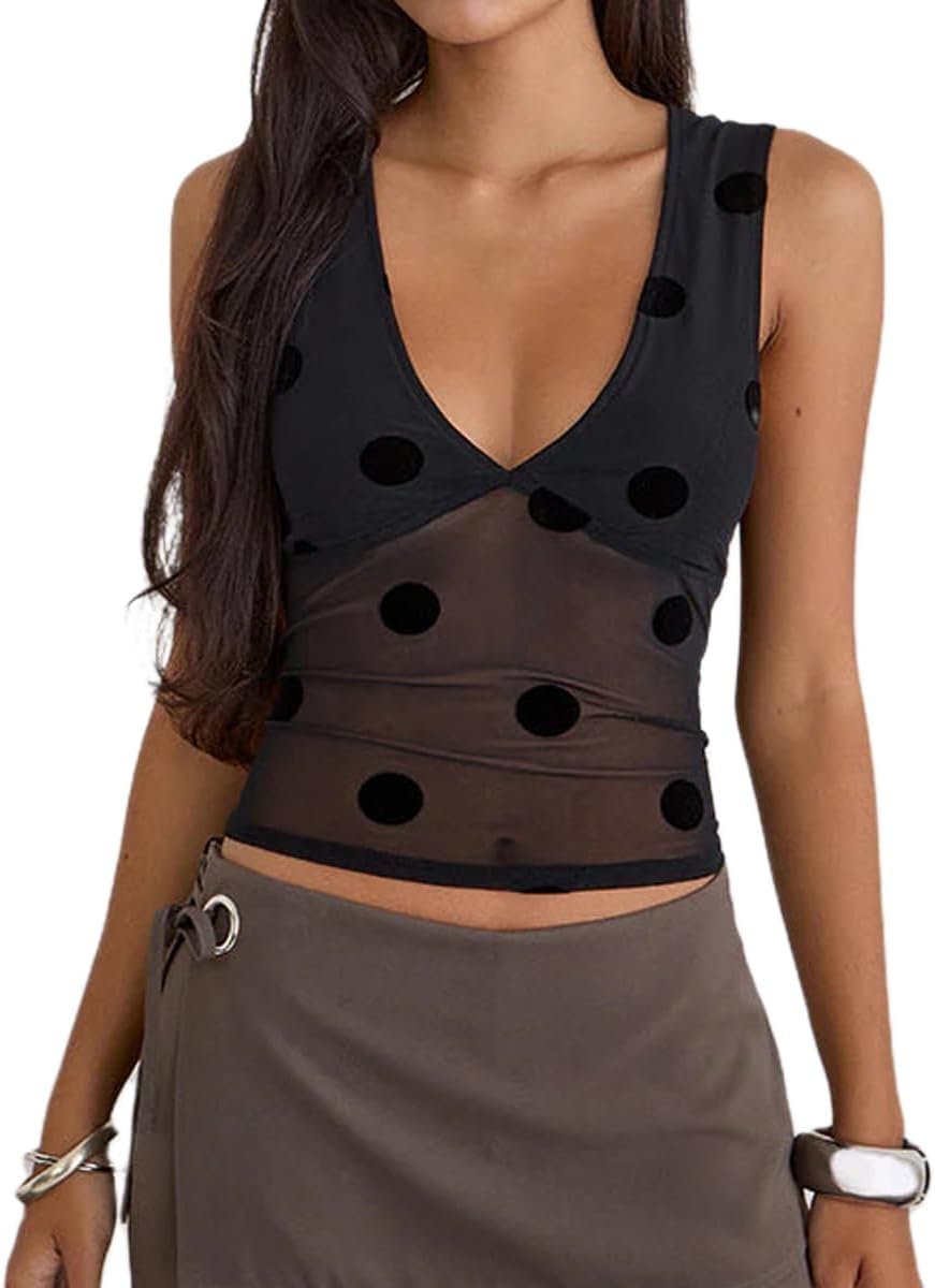 Women’s Y2K Sheer Mesh Polka Dot Top Sexy Deep V Neck Sleeveless Slim Fit See-Through Crop Tank Top Party Clubwear