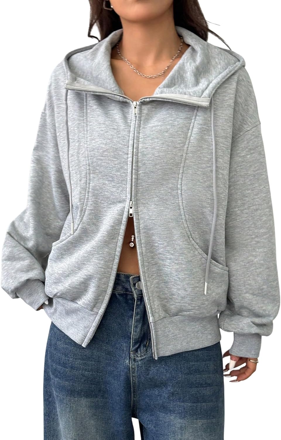 Verdusa Women's Zip Up Hoodie Streetwear Athletic Drop Shoulder Sweatshirt with Pockets