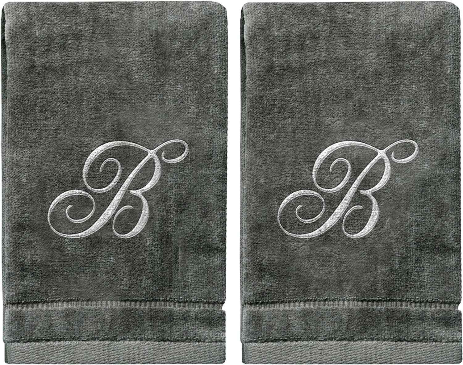 Monogrammed Towels Fingertip, Personalized Gift, 11 x 18 Inches - Set of 2- Silver Embroidered Towel - Extra Absorbent 100% Cotton- Soft Velour Finish - For Bathroom/ Kitchen/ Spa- Initial B (Gray)