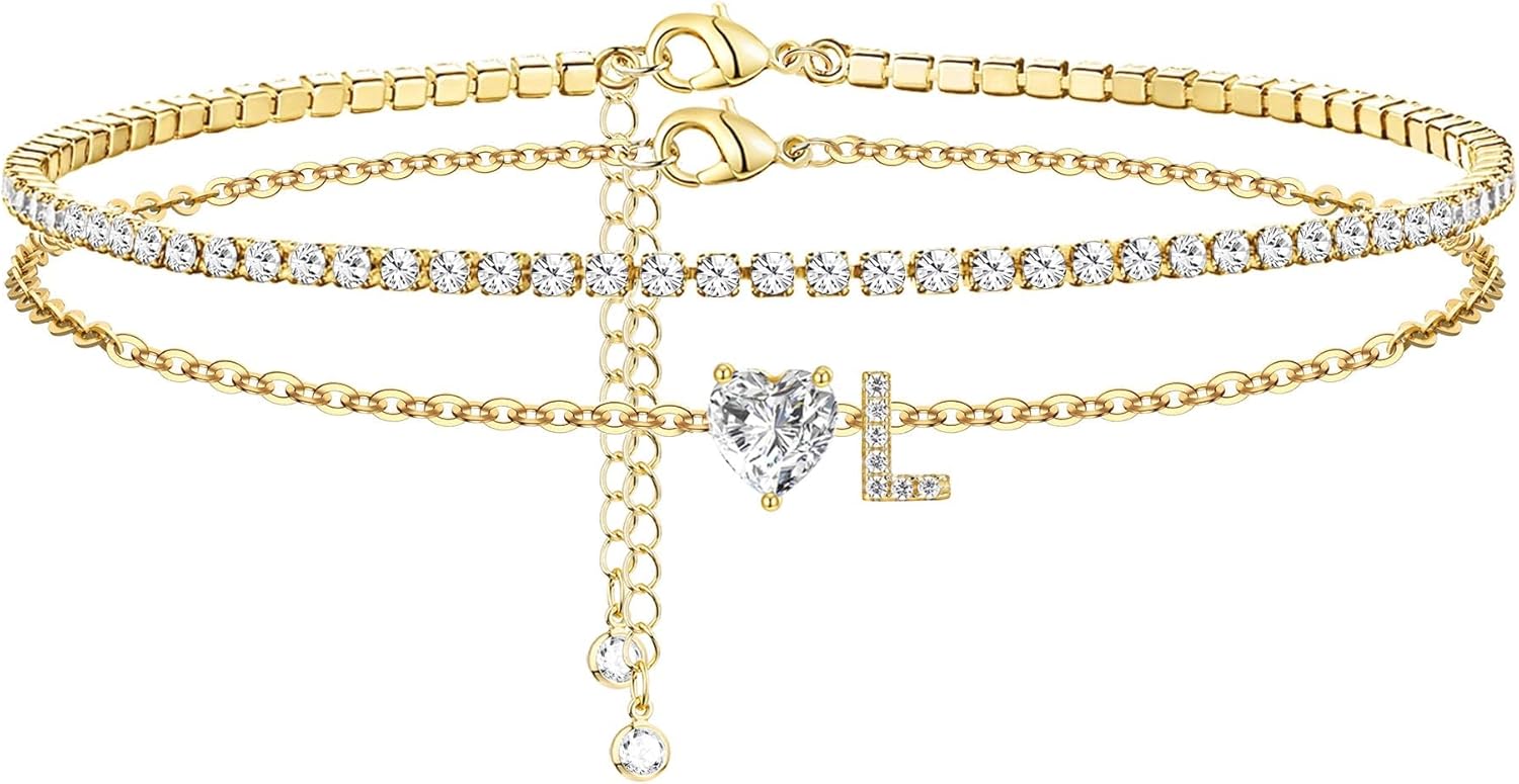 Gold Initial Ankle Bracelets for Women 14K Gold Plated CZ heart Tennis Anklets for Women Waterproof Layered Adjustable Letter Anklets Large Ankle Summer Beach Foot Jewelry
