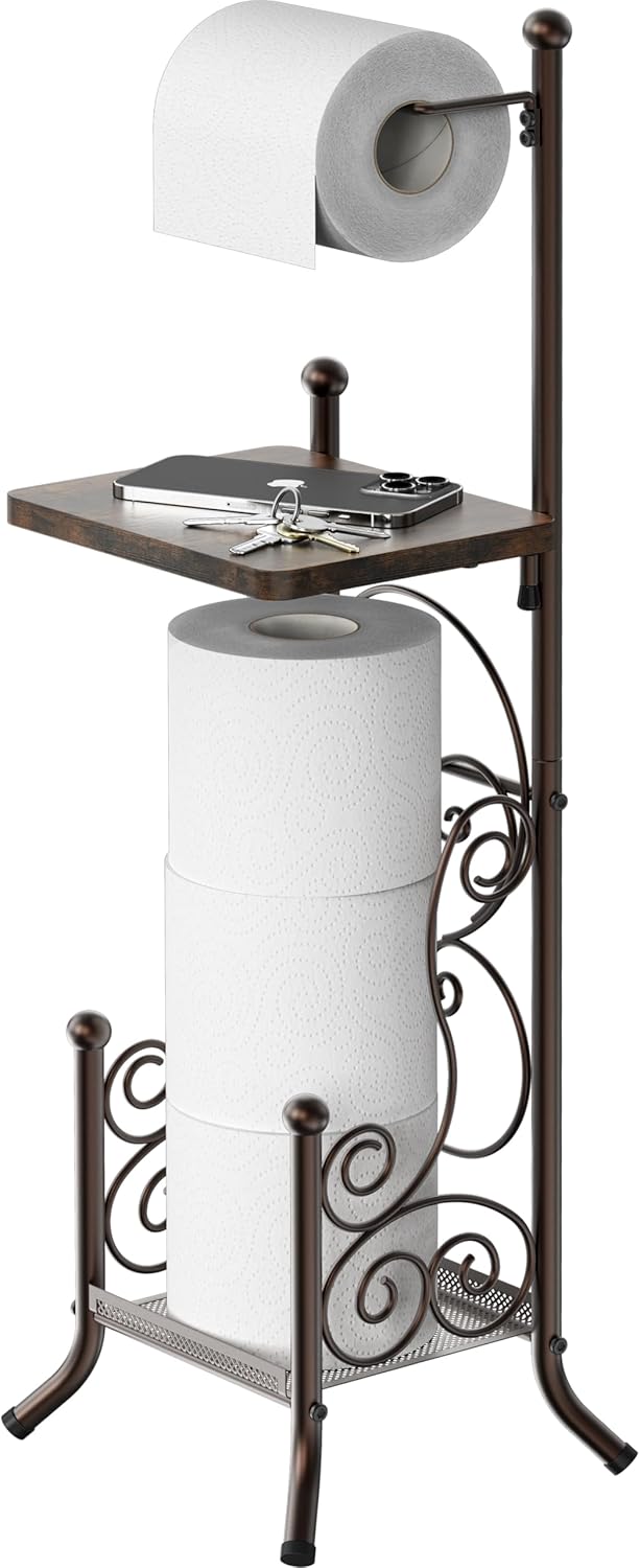 Simple Houseware English Style Bathroom Toilet Tissue Roll Holder Stand with Shelf, Bronze