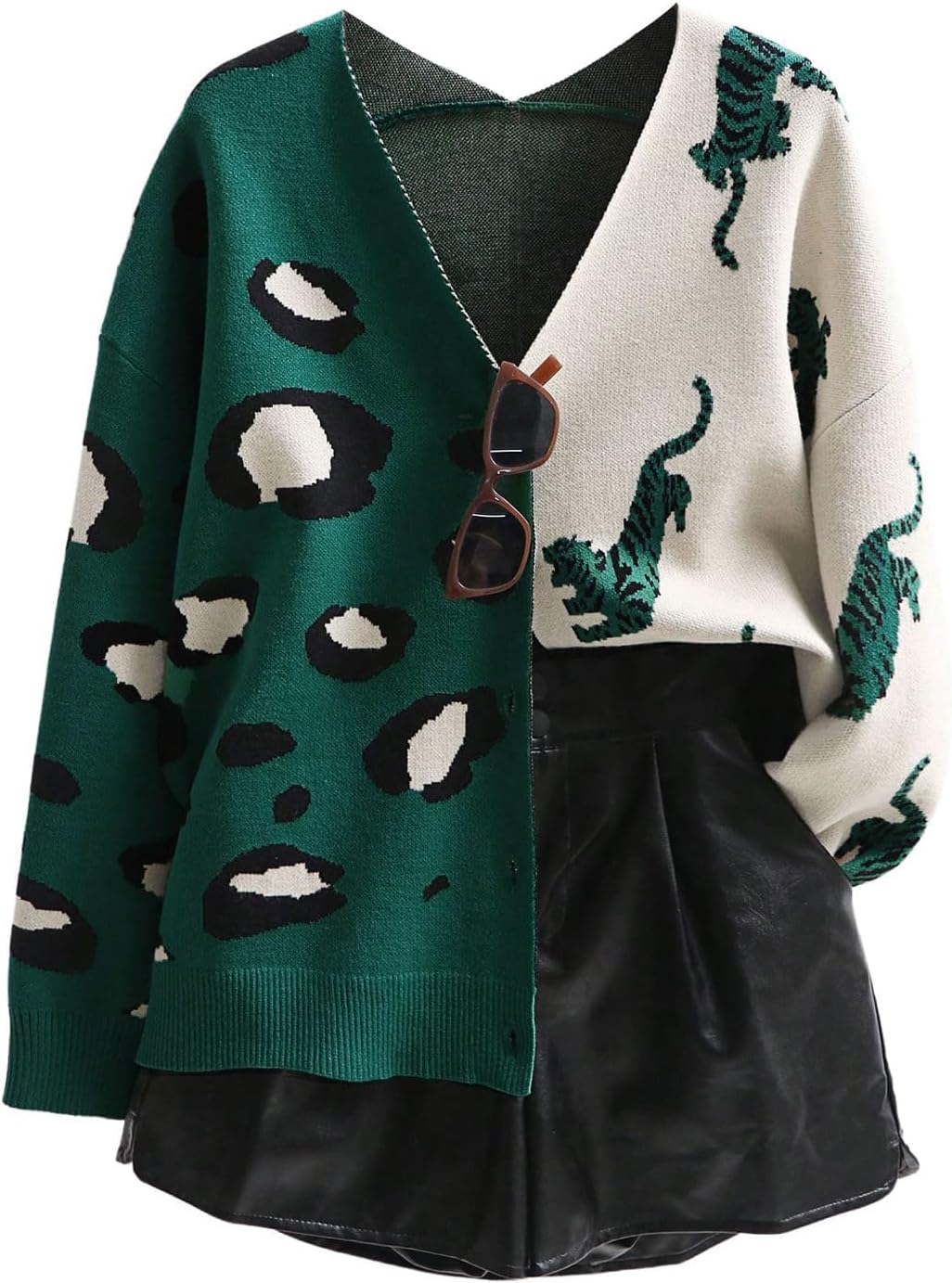 Leopard Tiger Print Cardigan Women: Color Block V Neck Sweater Long Sleeve Animal Print Outfits for Women
