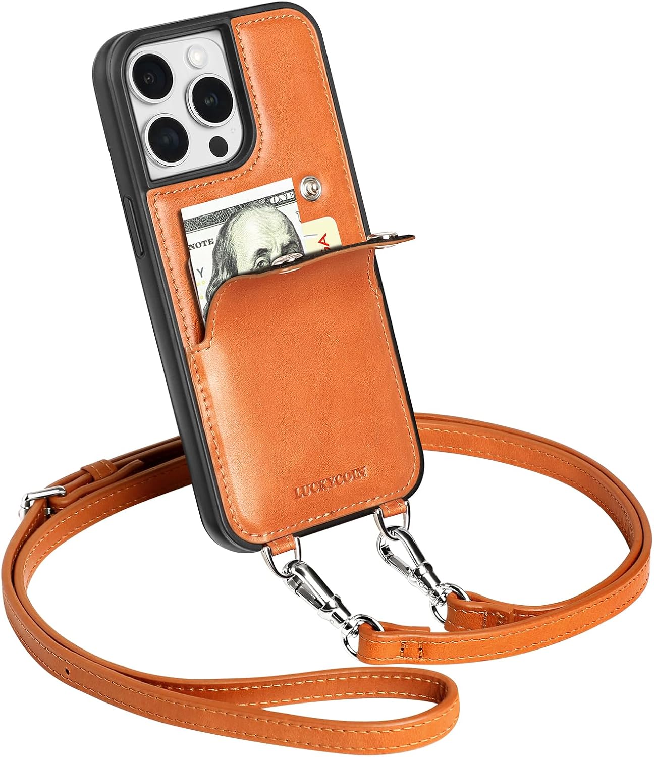 LUCKYCOIN Crossbody Wallet Phone Case for iPhone 15 Pro Max,Genuine Leather Wallet Phone Case with Card Holder,Phone Purse with Adjustable & Removable Strap,Travel Trendy Purses for Women - Brown