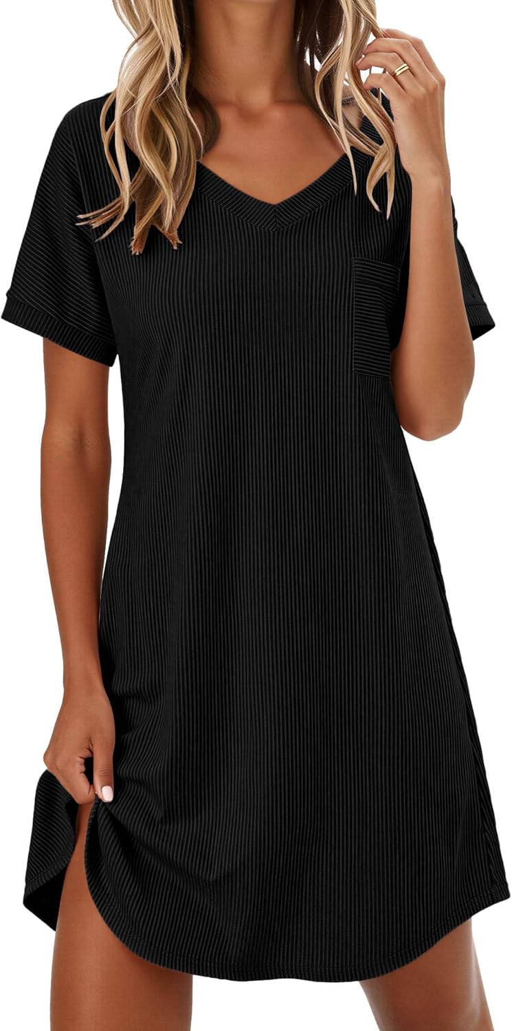 Ekouaer Womens Nightgowns Short Sleeve Sleepshirt V Neck Top Shirt Dress Soft Nightshirts Loose Loungewear S-3XL