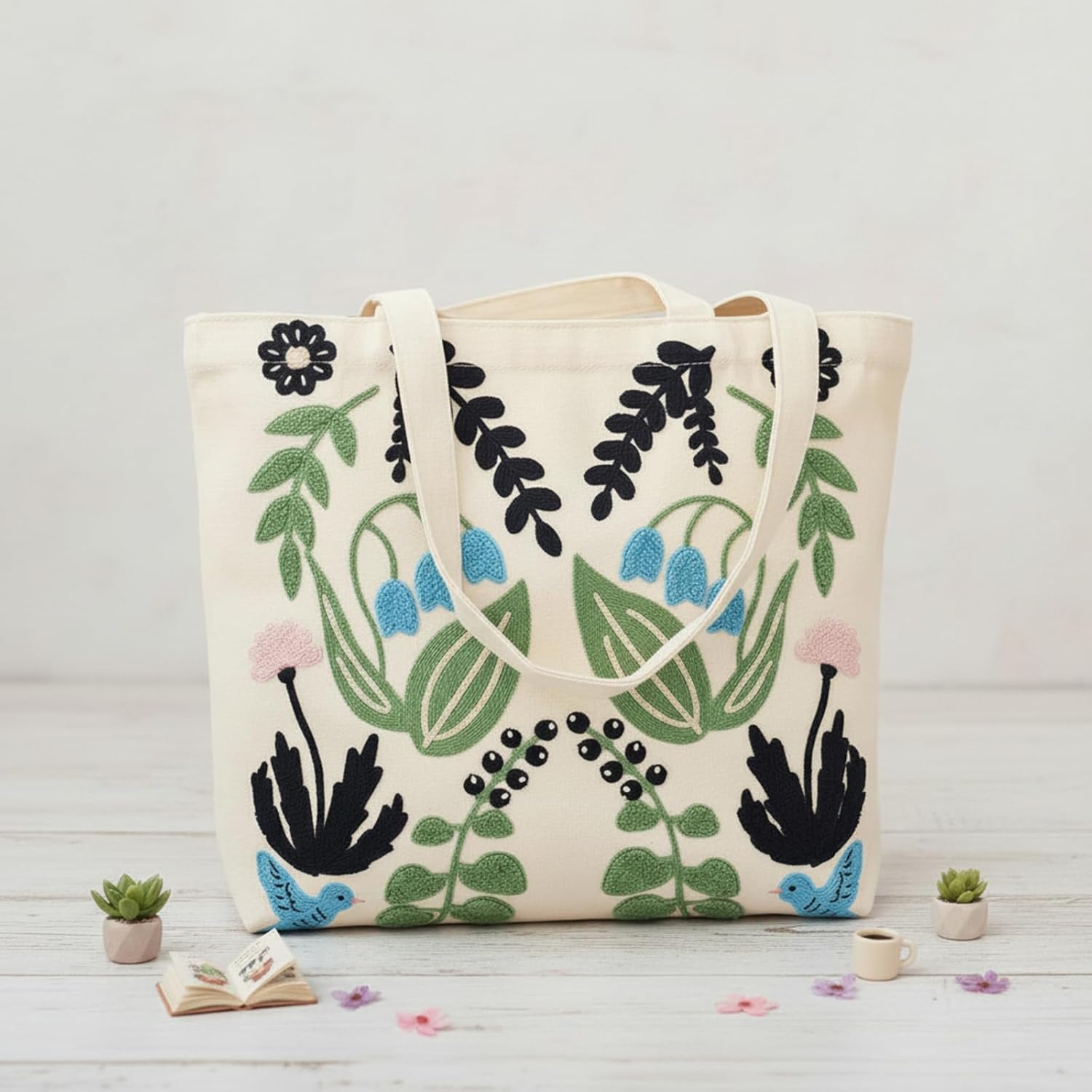 Aesthetic Embroidery Tote Bag for Women Cute Floral Embroidered Canvas Summer Reusable Farmhouse Cottage Shoulder Bag for Shopping Grocery Work Book
