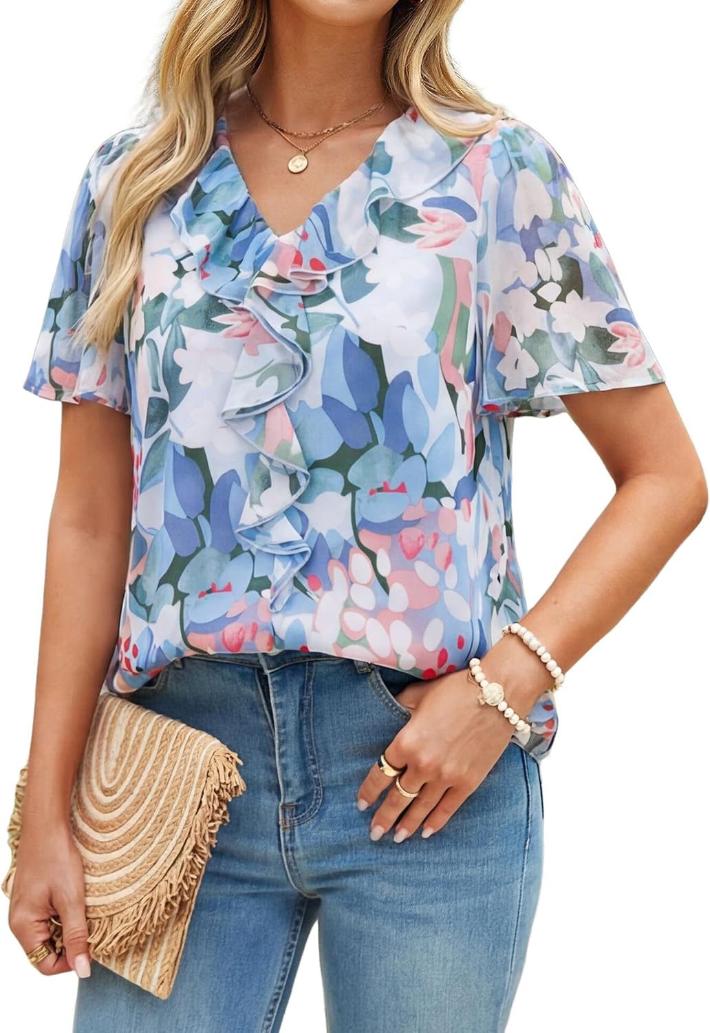 Simplee Womens Summer Floral Blouse Dressy Casual Chiffon Short Sleeve Boho Tops Ruffle V Neck Tops 2026 Trendy Shirt Clothes