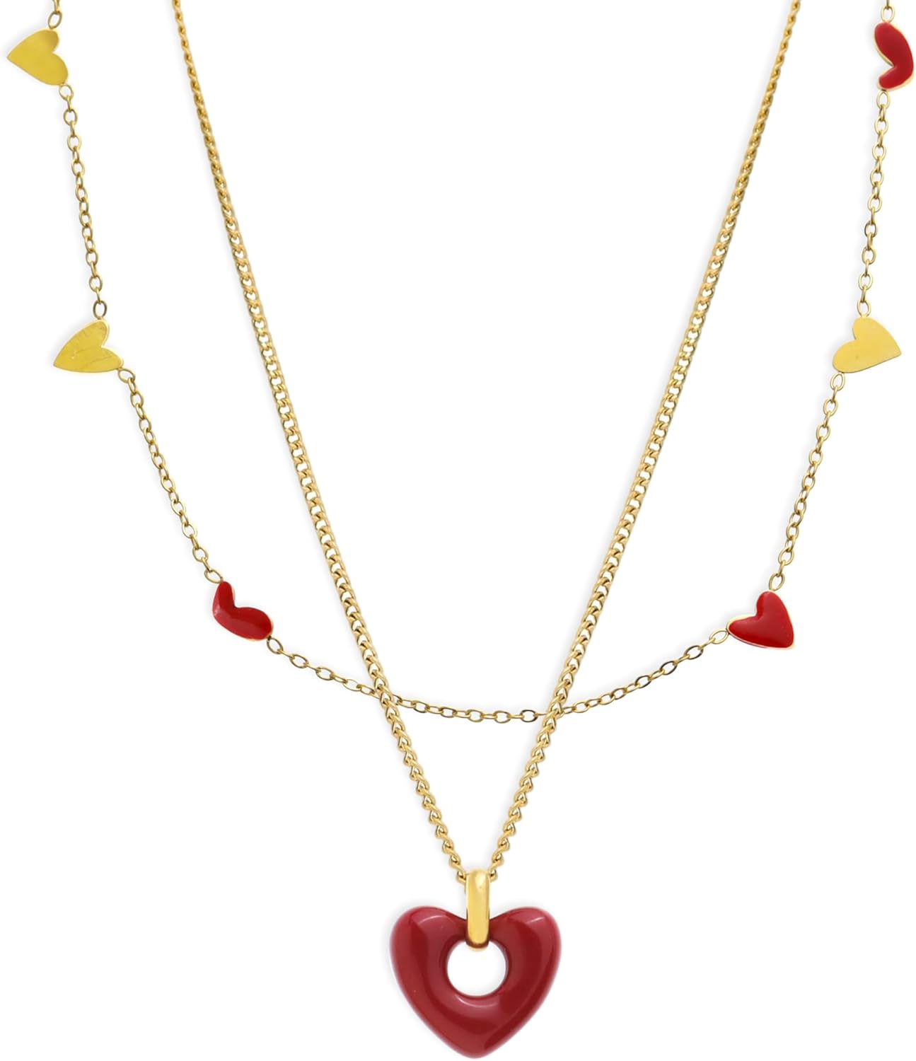 Sonateomber Valentine Gold Heart Layered Pendant Necklace for Women, Cute Red Hearts Charms Necklaces Prom Daily Fashion Accessories Jewelry Gift