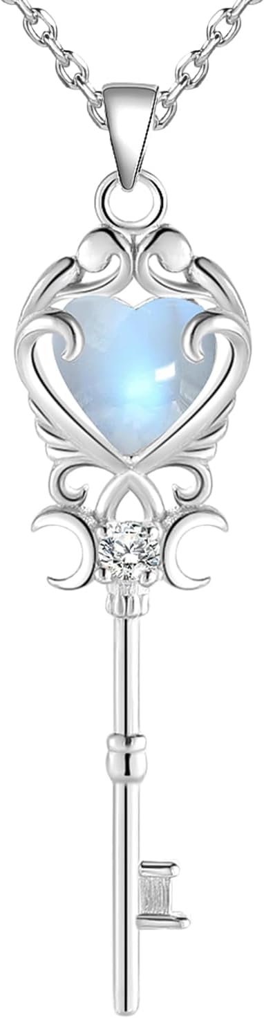 Natural Moonstone Crystal Key Necklace for Women, Retro Triple Moon Key Healing Crystal Wiccan Pagan Jewelry Gift