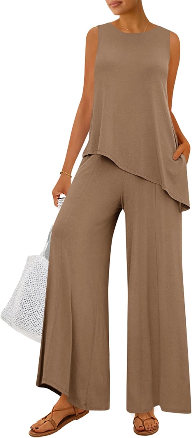 PRETTYGARDEN Women's 2026 Two Piece Matching Lounge Sets Asymmetrical Split Tank Tops Wide Leg Pants Summer Outfits Tracksuit
