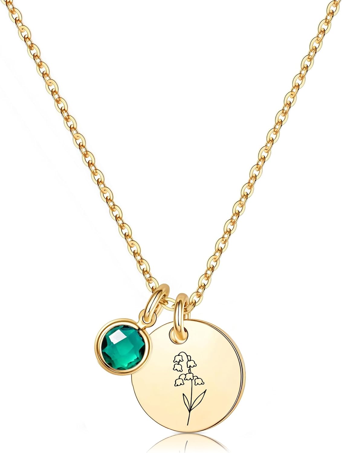 Birth Flower Necklaces for Women, 18K Gold Plated Dainty Birthstone Pendant Necklaces Handmade Birth Month Flower Jewelry Disc Coin Birthday Gifts for Women Girls Teens