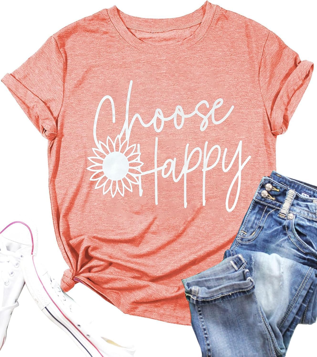 Graphic Tees for Women Choose Happy Letter Print Shirts Sunflower Women T Shirt Inspirational Short Sleeve Casual Tops