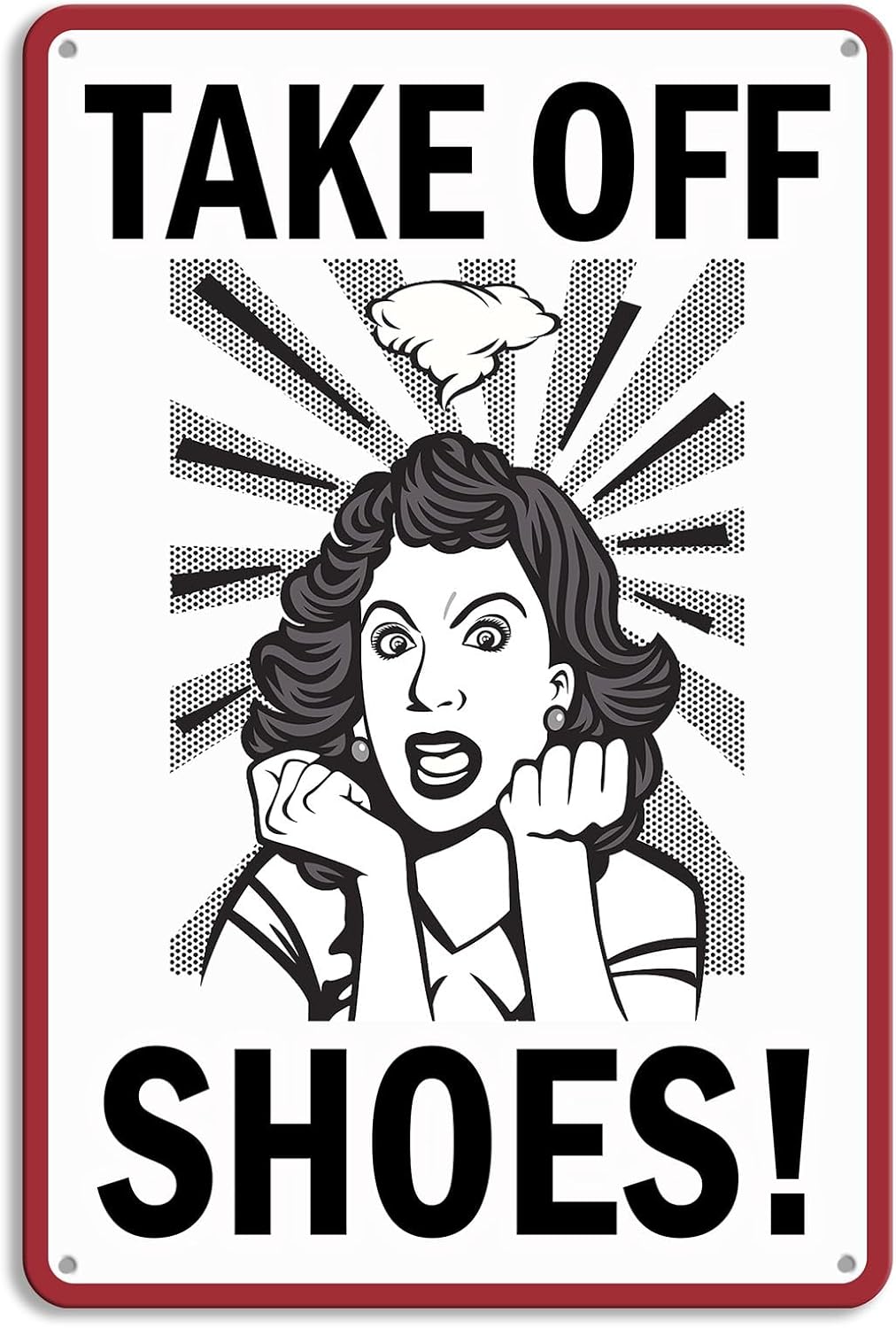 Take Off Shoes Metal Tin Sign - Funny No Shoes Sign for Front Door, Remove Shoes Sign for House Wall Décor, Cute and Humorous Hanging Door Sign for Entryway or Home, 8x12 Inch
