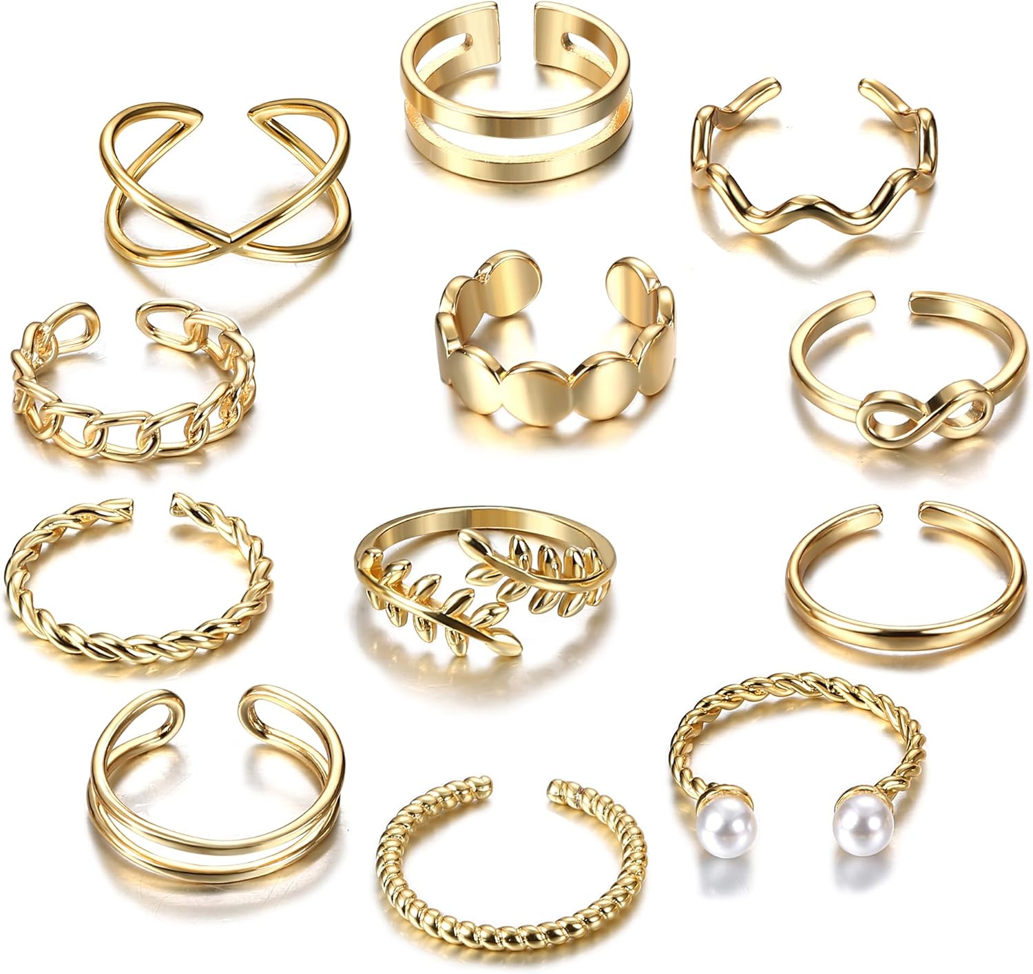 IRONBOX 12 Pcs Adjustable Knuckle Rings for Women 14K Gold Plated Stacking Rings Pack Wave Star Moon Dainty Thumb Open Rings Set