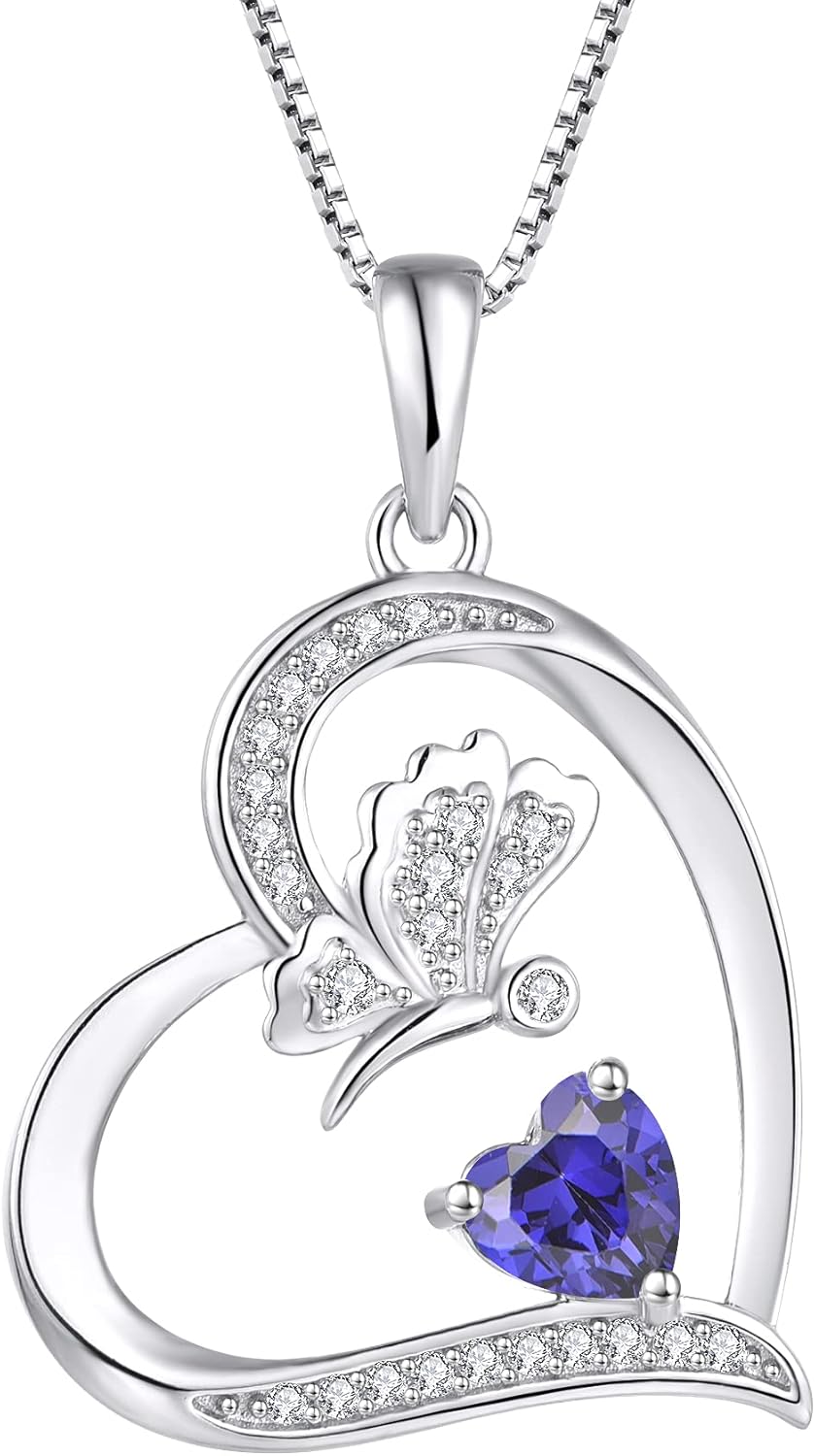 FJ Butterfly Necklace for Women 925 Sterling Silver Heart Birthstone Pendant Jewelry Gifts for Wife Girlfriend Mom Daughter