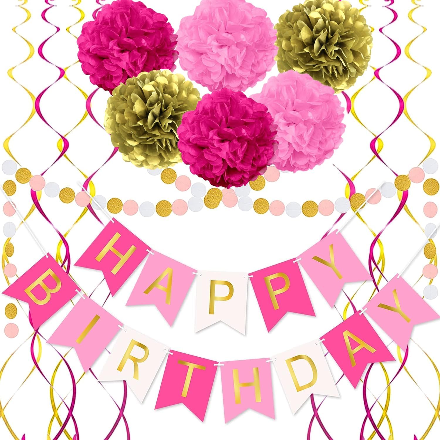 - 【Beautiful Party Set】Birthday party decorations has everything you need to decorate the birthday party. The Hot Pink and Gold birthday supplies set include 6pcs pom poms + HAPPY BIRTHDAY banner + 13.2ft long pink white gold circle garland + 6pcs pink gold swirl streamers.